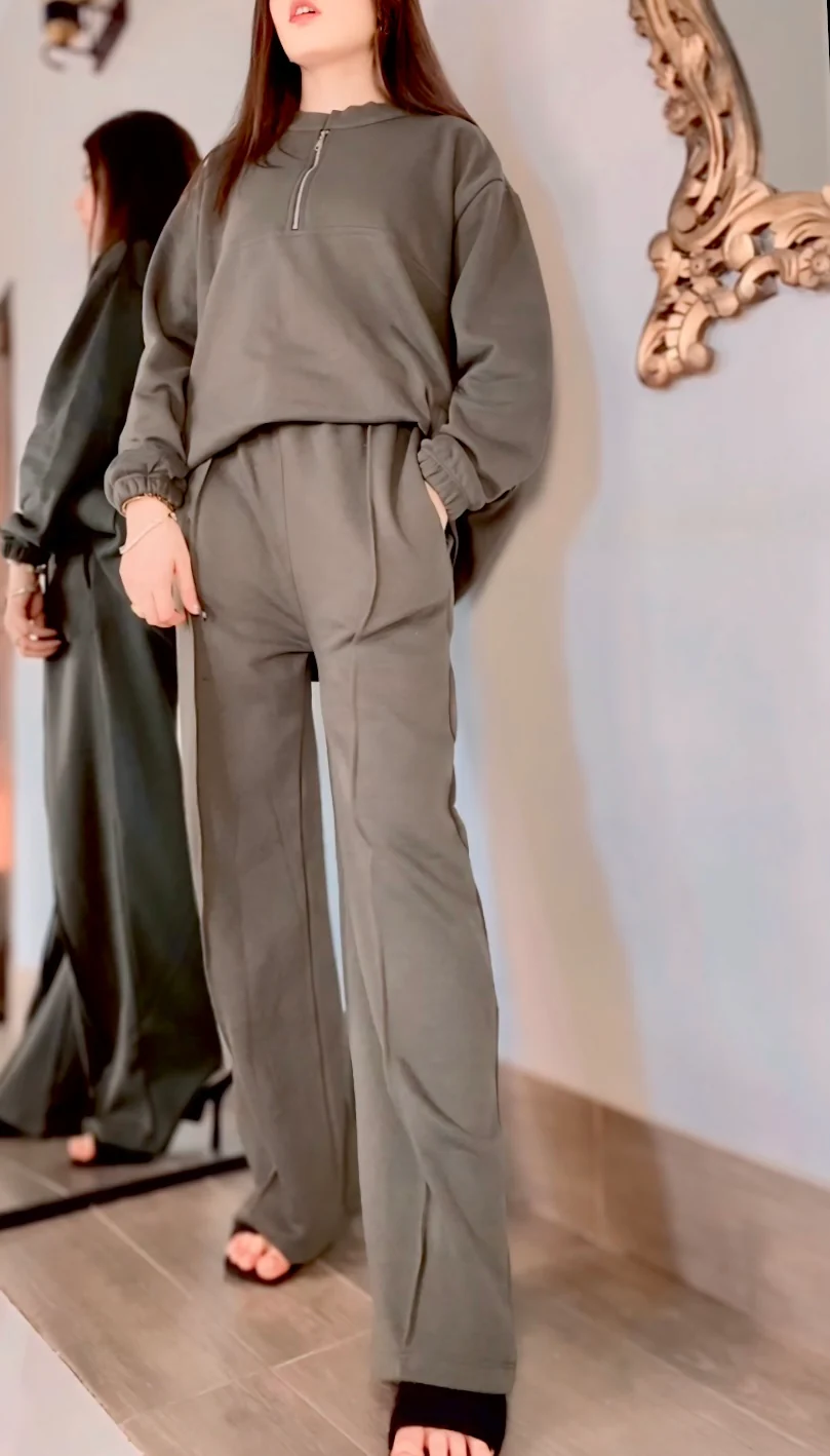 The set includes a cozy sweatshirt with side pockets + soft sweatpants, giving you the perfect winter look for home, university, casual outings, or daily wear 😍🔥. Available in 5 beautiful colors and Medium, Large, and X-Large sizes.